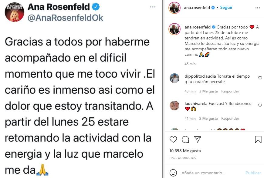 "En el día de ayer después de un largo viaje lloré desconsolada al ver que dejaba físicamente tu cuerpo en un lugar profundo en la tierra, pero sabe amorcito que tu corazón, tu alma, tu rostro sonriente toda nuestra vida juntos no están ahí. Todo lo tengo en otro lugar escondido, que solo vos y yo conocemos! Nada nos va a separar jamás! Te amé, te amo y te amaré para toda la vida!", fueron las conmovedoras palabras de la abogada junto a un corazón rojo.