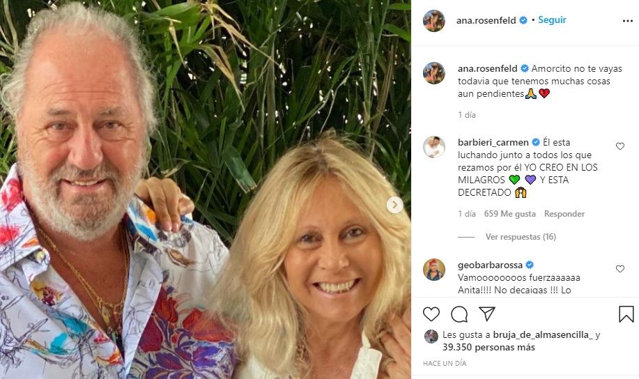 El domingo, Rosenfeld compartió otro desgarrador mensaje pidiendo por la recuperación de su pareja: "Amorcito no te vayas todavía que tenemos muchas cosas aun pendientes".
