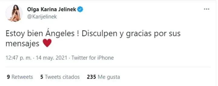El mensaje causó intranquilidad y alertó a sus seguidores, colegas y amigos. Sin embargo a las 12.47 volvió a utilizar su cuenta de Twitter para comunicar: "Estoy bien Ángeles ! Disculpen y gracias por sus mensajes".