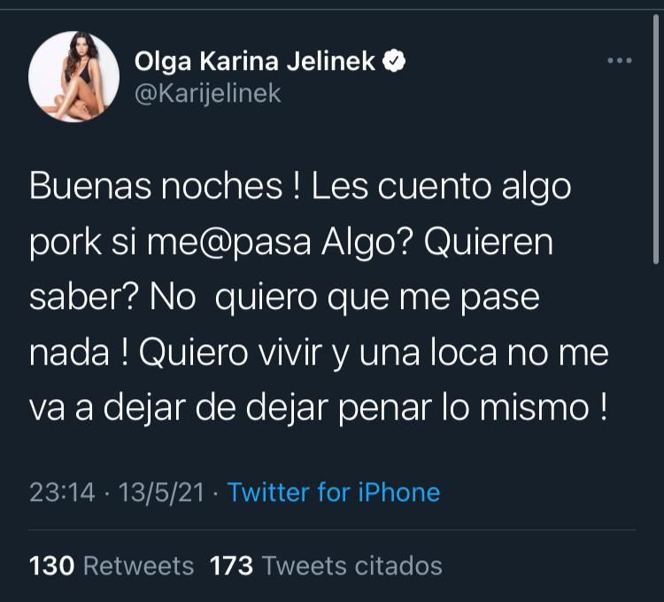 "Buenas noches! Les cuento algo pork si me@pasa Algo? Quieren saber? No quiero que me pase nada! Quiero vivir y una loca no me va a dejar de dejar penar lo mismo !", escribió la morocha en su cuenta de Twitter, e inmediatamente los internautas comenzaron a preguntarse si la modelo estaba en peligro.
