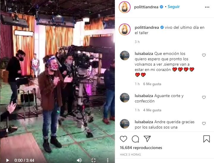 LEER MÁS: Termina "Corte y confección", el programa que conduce Andrea Politti Embed -Andrea Politti- Quedan apenas dos programas donde se conocerá al ganador de la temporada."Y se cierran las puertas de este taller maravilloso", señaló Politti antes de cerrar las puertas.Antes, hizo desfilar -y ella también lo hizo- a todos sus compañeros de programa.LEER MÁS: Andrea Politti se quebró al hablar de su padre a 40 años de su muerte El video. Embed