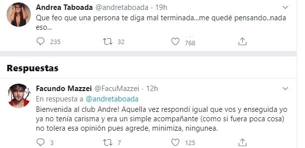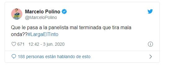 El comentario de Polino no le gustó nada bien a Taboada, quien desde la red social del pajarito indicó: "Qué feo que una persona te diga mal terminada... Me quedé pensando... Nada, eso...".