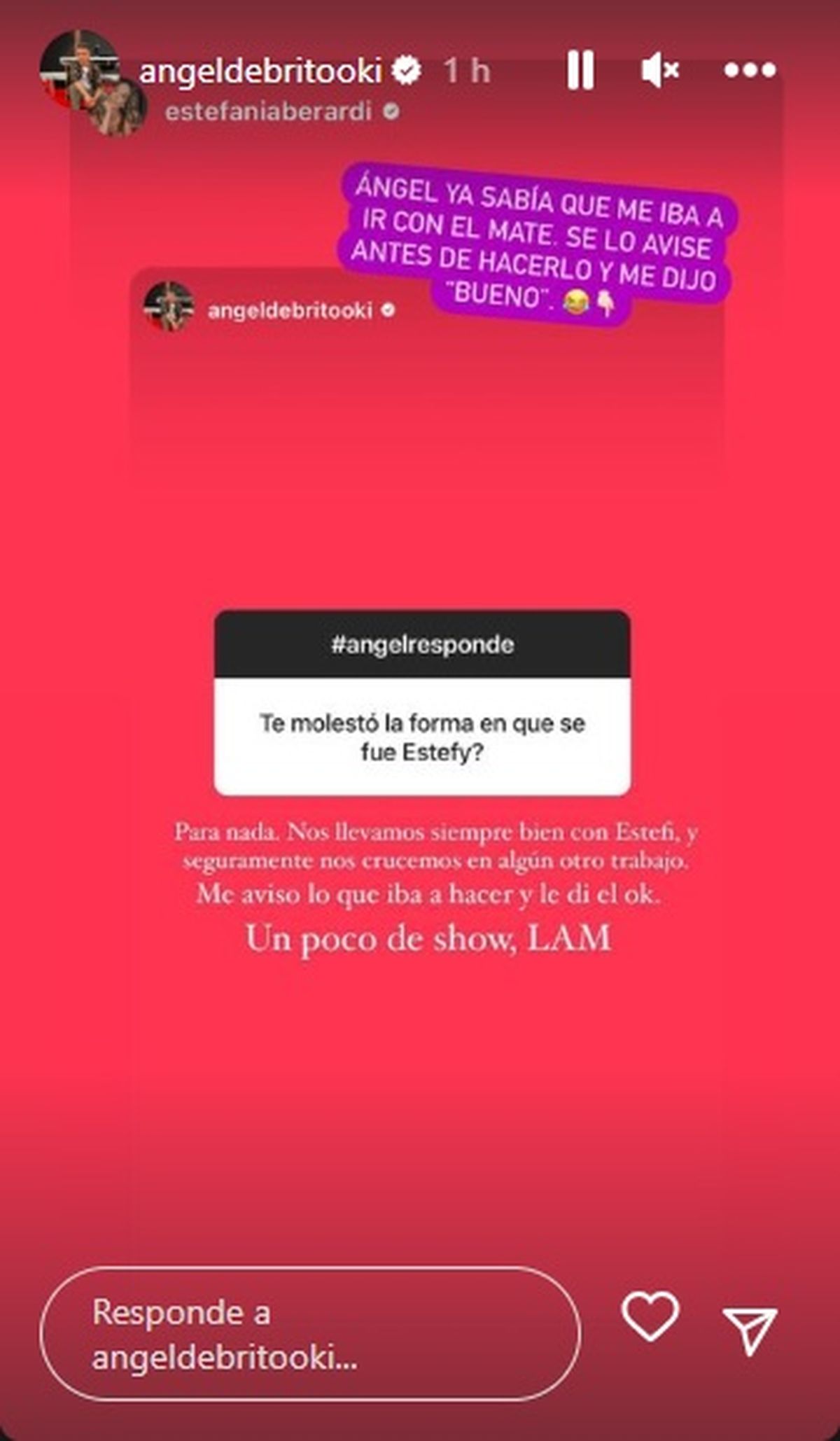 Por último, sobre si le molestó la forma en que se fue Estefi, Ángel de Brito apeló nuevamente a la sinceridad: "Para nada. Nos llevamos siempre bien con Estefi, y seguramente nos crucemos en algún otro trabajo. Me avisó lo que iba a hacer y le di el ok. Un poco de show, LAM", respuesta que fue reposteada por la propia Berardi confiando que lo del mate incluso estaba hablado.