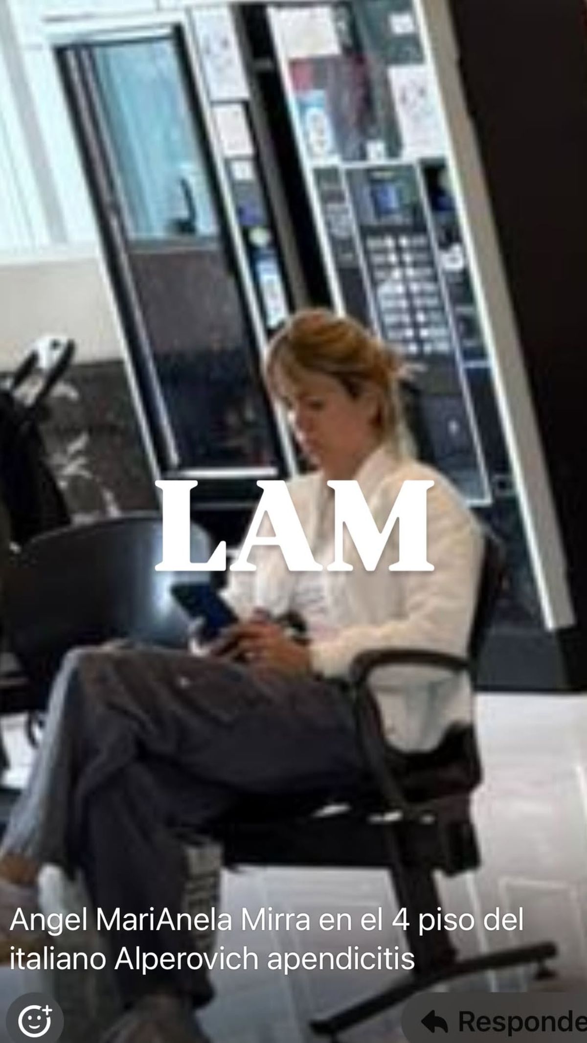 El conductor Ángel de Brito compartió en sus redes sociales imágenes de Marianela Mirra acompañando a su esposo en el centro médico. Sobre una de las fotos de la ex Gran Hermano, que le envió una seguidora, se leía: "Ángel, Marianela Mirra, en el cuarto piso del Hospital Italiano".