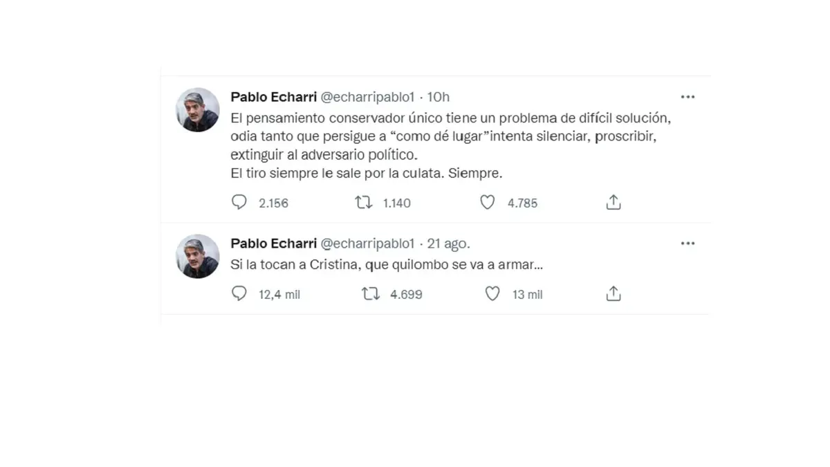 "El pensamiento conservador único tiene un problema de difícil solución, odia tanto que persigue a “como dé lugar” intenta silenciar, proscribir, extinguir al adversario político. El tiro siempre le sale por la culata. Siempre", agregó después Pablo Echarri.