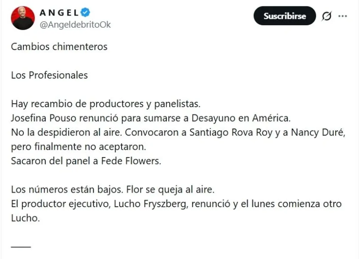 El panorama se completa con más cambios estructurales que alimentan la incertidumbre. “Los números están bajos. Flor se queja al aire. El productor ejecutivo, Lucho Fryszberg, renunció y el lunes comienza otro Lucho”, remató Ángel de Brito, dejando en evidencia que la calma está lejos de llegar al programa.