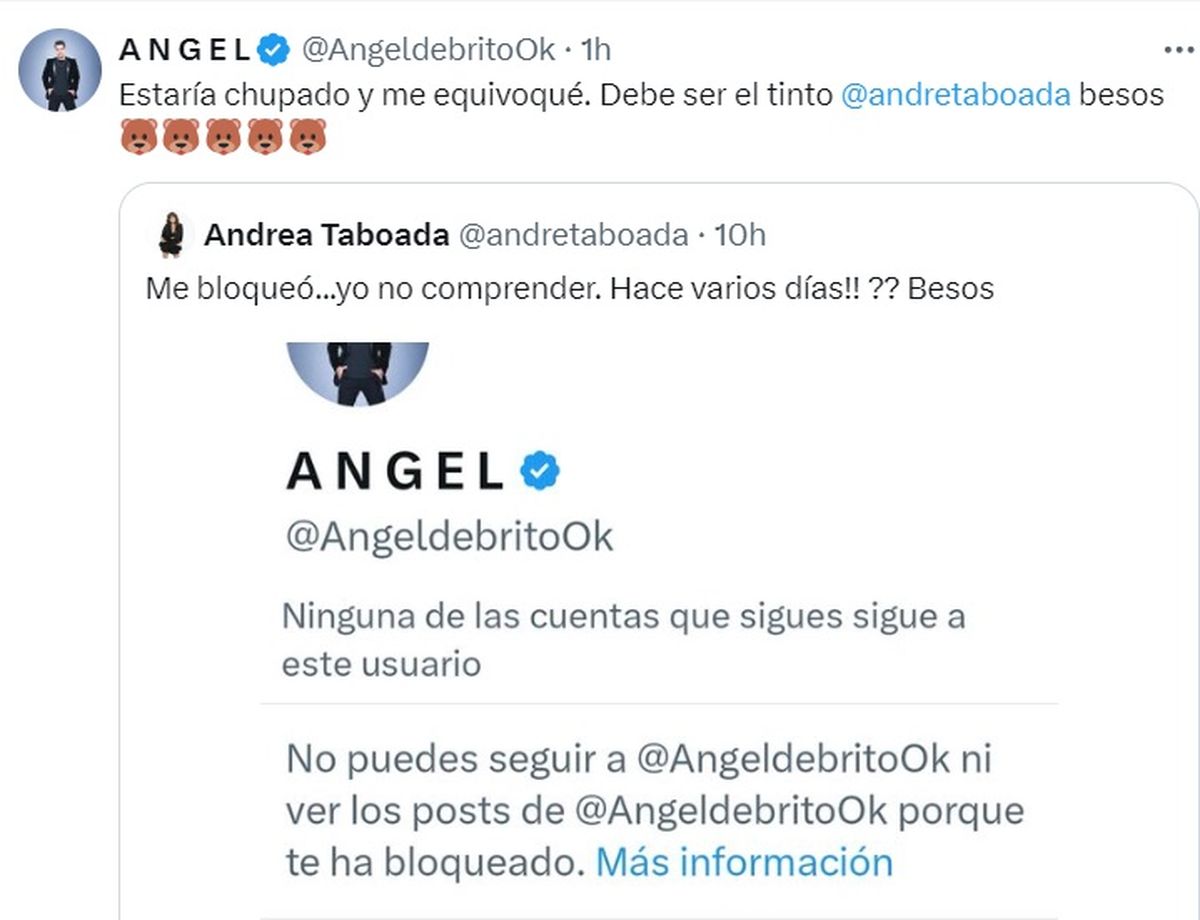 Al ver estos mensajes de su es compañera, Ángel de Brito utilizó la misma red social para despejar cualquier tipo de especulación y aclaró por qué bloqueó a Taboada de sus redes sociales.