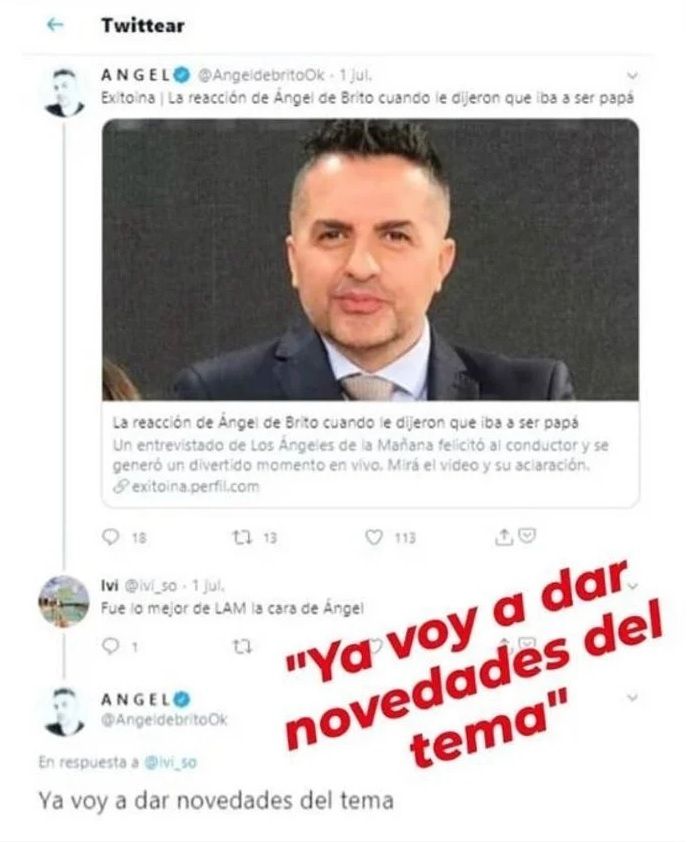 Luego, en otra foto sacada de una captura en Twitter, Ángel responde a una nota en donde se hace referencia a un momento en que un televidente lo felicitó por su paternidad. "Ya voy a dar novedades del tema", acotó.