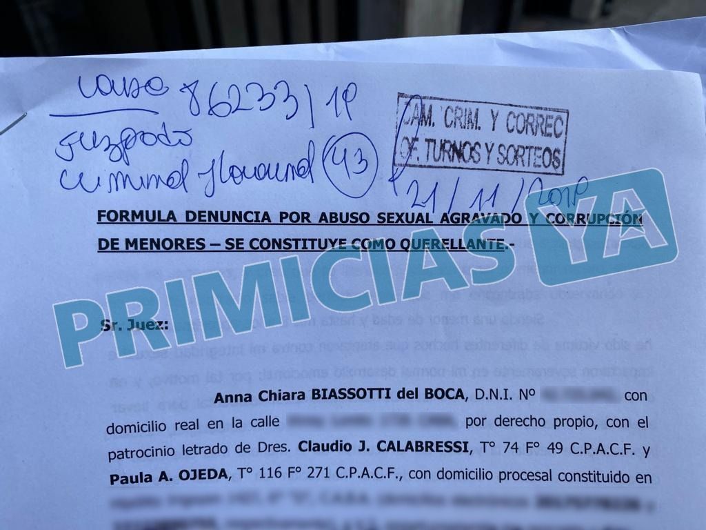 Este jueves por la mañana se presentó ante la Cámara en lo Criminal de la Ciudad de Buenos Aires la denuncia formal de Anna Chiara Biasotti del Boca contra su padre, Ricardo Biasotti, por los delitos de abuso sexual agravado y corrupción de menores agravada.