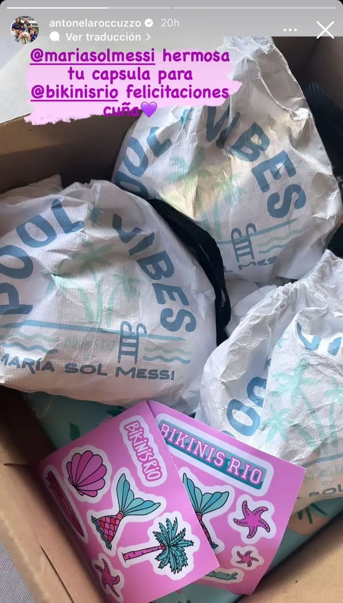 Antonela subió a su Instagram una foto de las bolsas que le llegaron y felicitó a María Sol por animarse. “Hermosa tu cápsula, felicitaciones cuña”, escribió la mujer de La Pulga.