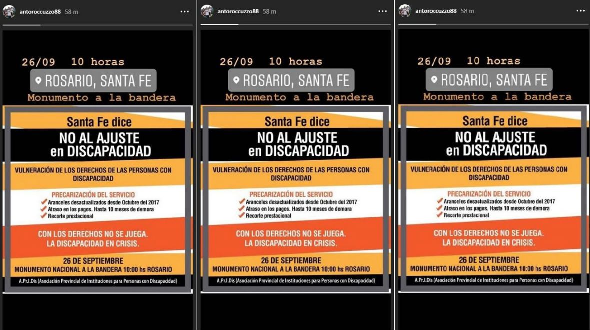 Roccuzzo, que suele ser bastante cuidadosa en sus posteos de redes sociales, publicó una story con una convocatoria a una marcha contra el ajuste en discapacidad que se realizará en Santa Fe, la provincia de donde son oriundos tanto ella como su marido.