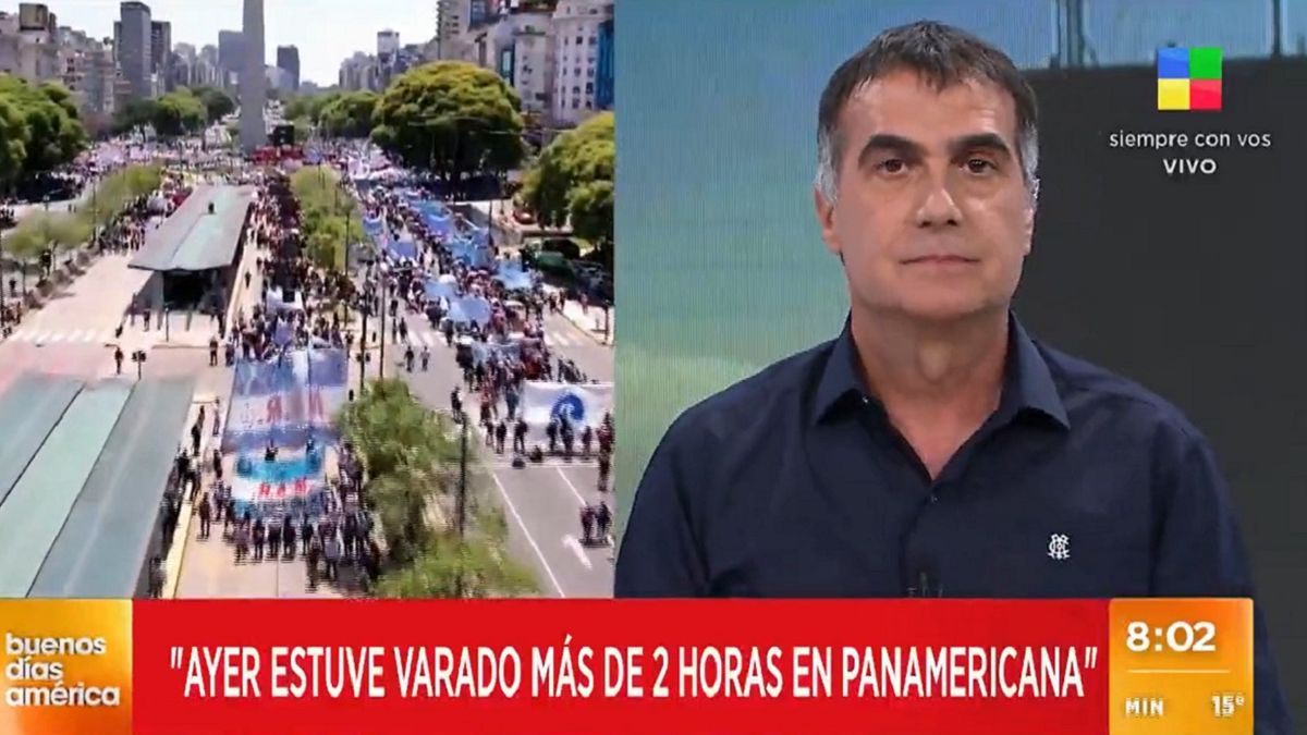 Antonio Laje habló en Buenos Días América, América Tv, de la jornada de piquetes que hubo el jueves cortando a los accesos a la Ciudad y se mostró furioso al quedar varado más de dos horas en uno de ellos, tanto a la ida como a la vuelta.