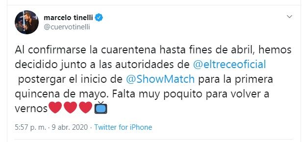 Desde sus redes sociales, el conductor escribió: “Al confirmarse la cuarentena hasta fines de abril, hemos decidido junto a las autoridades de @eltreceoficial postergar el inicio de @ShowMatch para la primera quincena de mayo. Falta muy poquito para volver a vernos”.