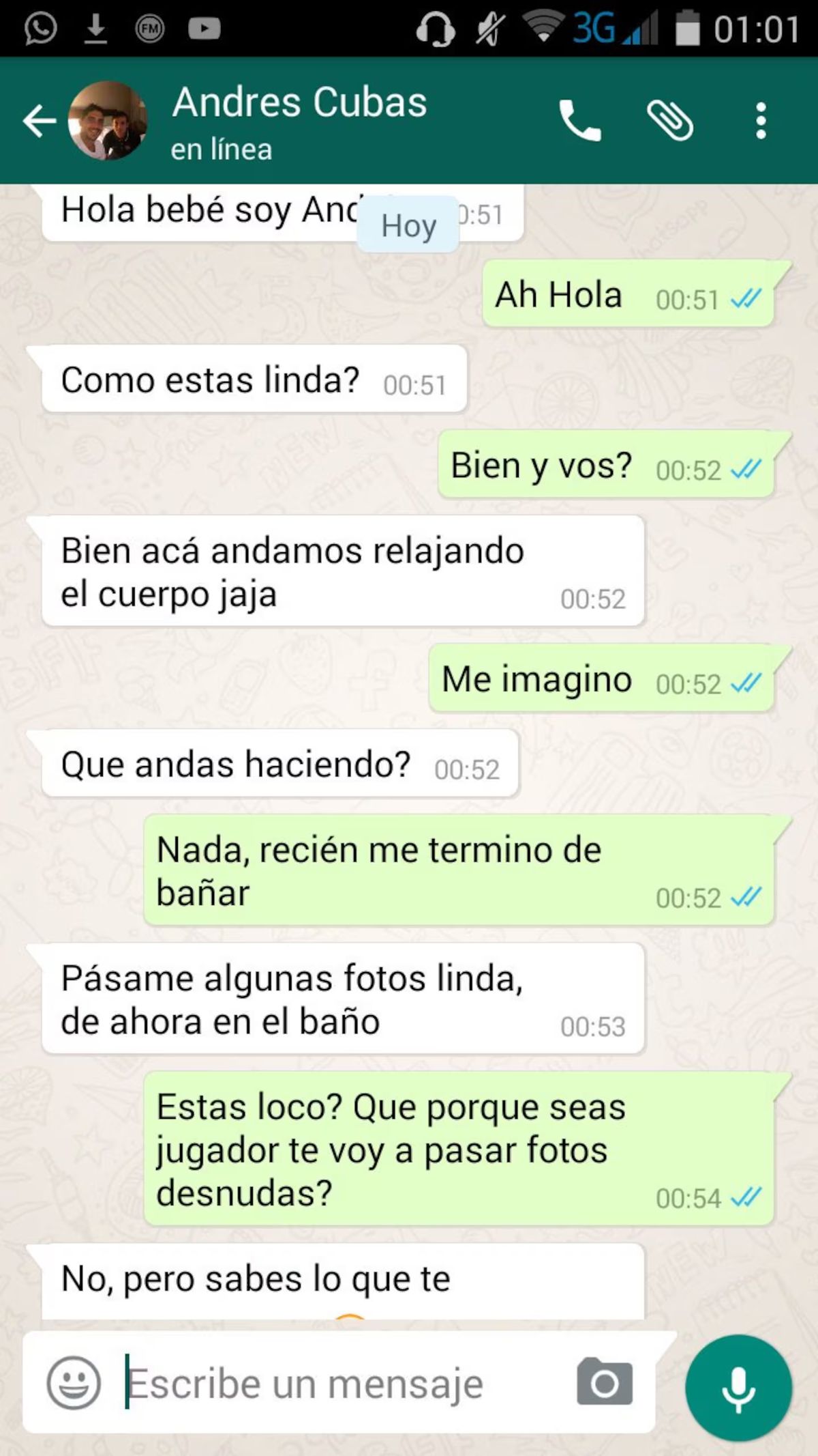 En la conversación, el jugador le escribió: "Pasame algunas fotos, linda, de ahora en el baño", luego de que la cantante le contara que acababa de bañarse. Ella se negó y él retrucó: "No sabés lo que te perdés conmigo". La respuesta de Emilia fue tajante: "No me pierdo nada, querido, no te confundas".
