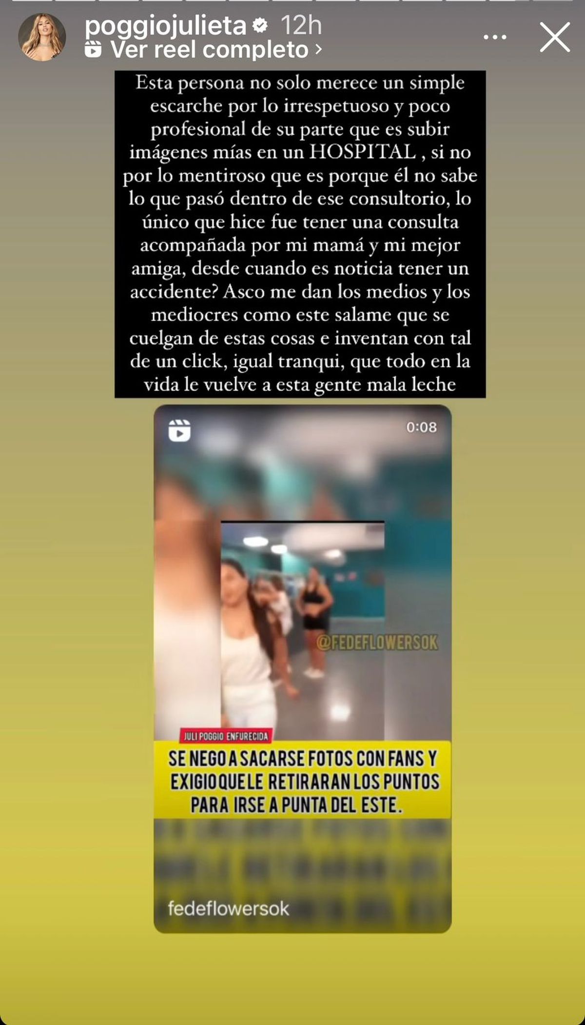 Por último, Poggio concluyó claramente enojada: “¿Desde cuándo es noticia tener un accidente? Asco me dan los medios y los mediocres como este salame que se cuelgan de estas cosas e inventan con tal de un click”.