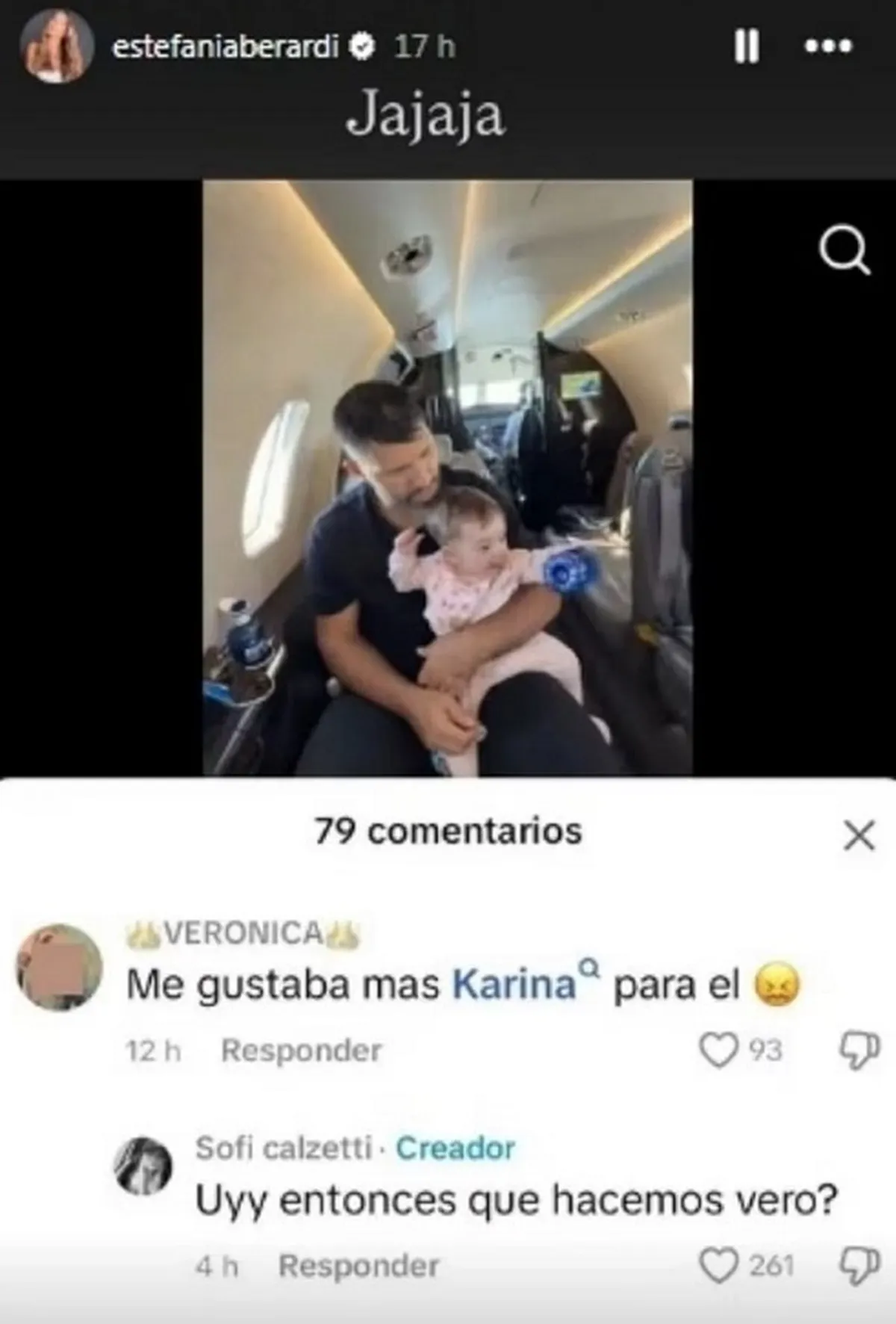 Sin embargo, a comienzos de mayo de este año, Calzetti protagonizó un inesperado cruce virtual que no pasó inadvertido. Todo comenzó cuando una usuaria de Instagram la comparó con Karina, la Princesita, expareja del exjugador entre 2012 y 2017. “Me gustaba más Karina para él”, escribió la seguidora junto a un polémico emoji, comentario que luego fue replicado por Estefanía Berardi a través de sus redes, tal como suelen hacer los distintos comentaristas del mundo del espectáculo.