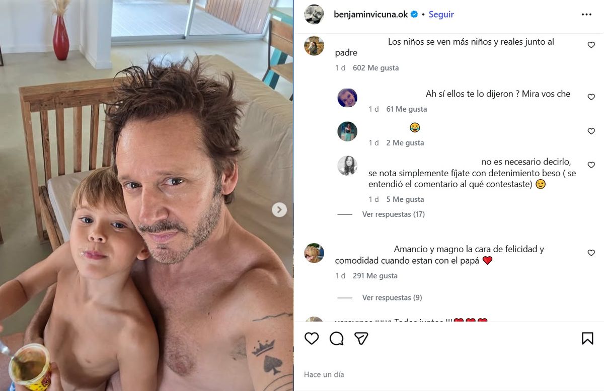 "Los niños se ven más niños y reales junto al padre", marcó uno de los seguidores del chileno en el posteo. A lo que otro añadió: "Amancio y Magno la cara de felicidad y comodidad cuando estan con el papá". "Esos pequeños si saben de infancia real", comentó otro perfil. "Bellos niños, con papi", "En cosas simples esta la felicidad de los niños. No importa la cantidad en tiempo si en la calidad", señalaron otras cuentas.