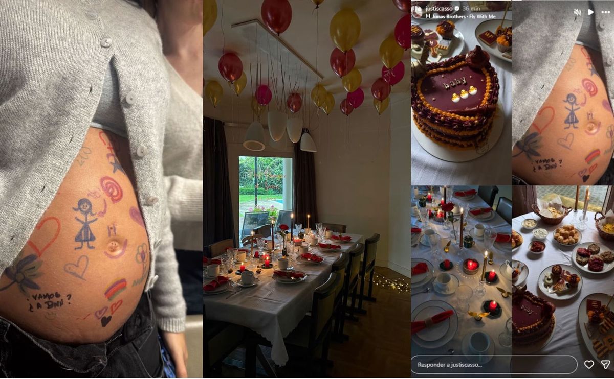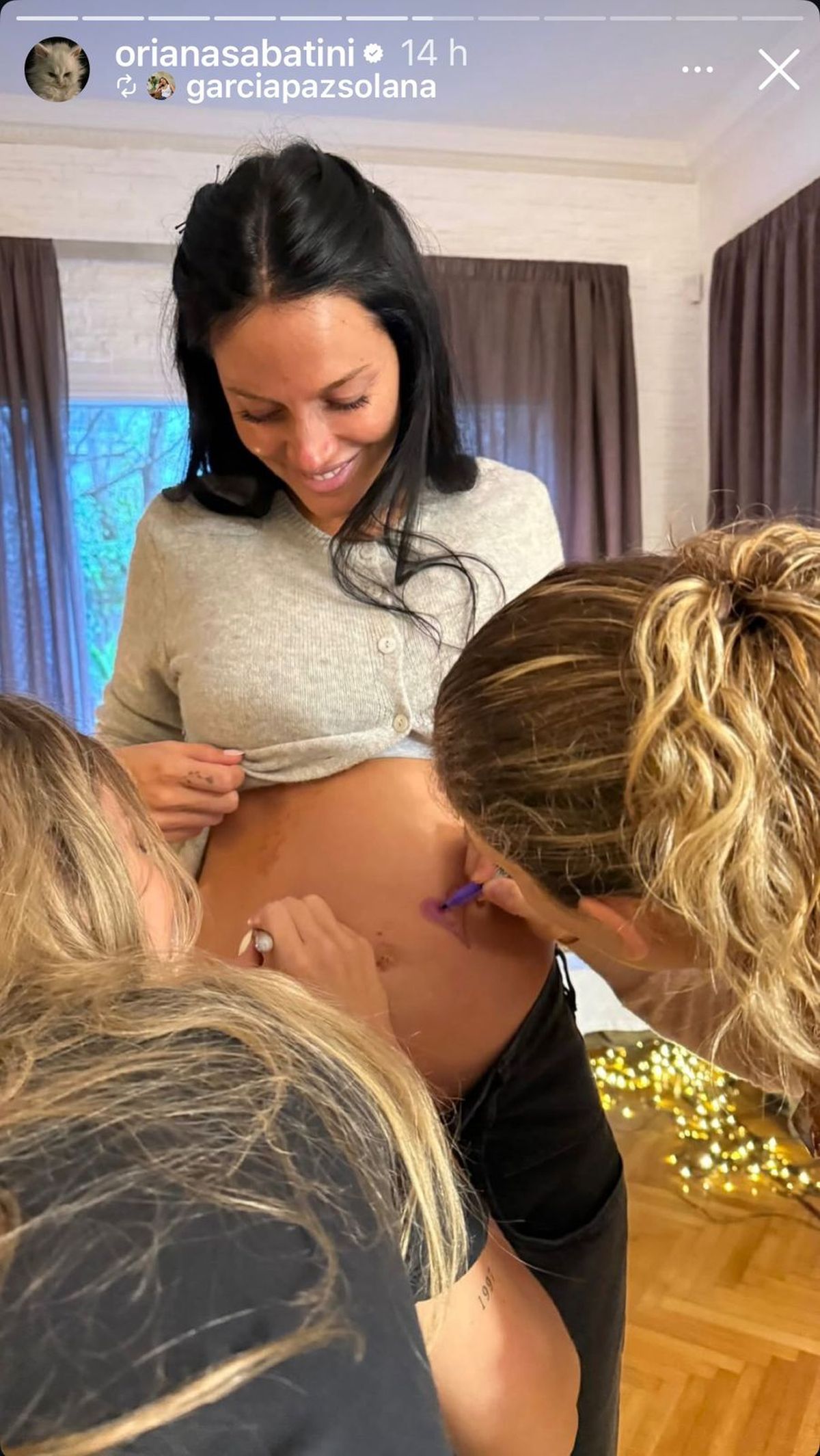 Claro que uno de los momentos más especiales y emotivos del baby shower, sin duda fue el que quedó reflejado en una de las fotografías que se viralizaron por estas horas: la ya prominente panza de Oriana decorada por sus amigas y familiares con marcadores. Imágenes de arcoíris, corazones, flores, caritas felices y frases como "Vamos Dnn", reflejan la alegría compartida por el grupo.