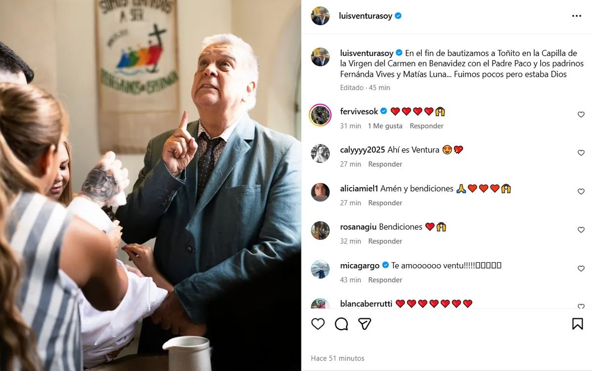 "En el finde bautizamos a Toñito en la capilla de la Virgen del Carmen en Benavidez con el Padre Paco y los padrinos Fernanda Vives y Matías Luna. Fuimos pocos pero estaba Dios", indicó Luis desde su cuenta en Instagram conmovido por el importante acto religioso de su hijo.