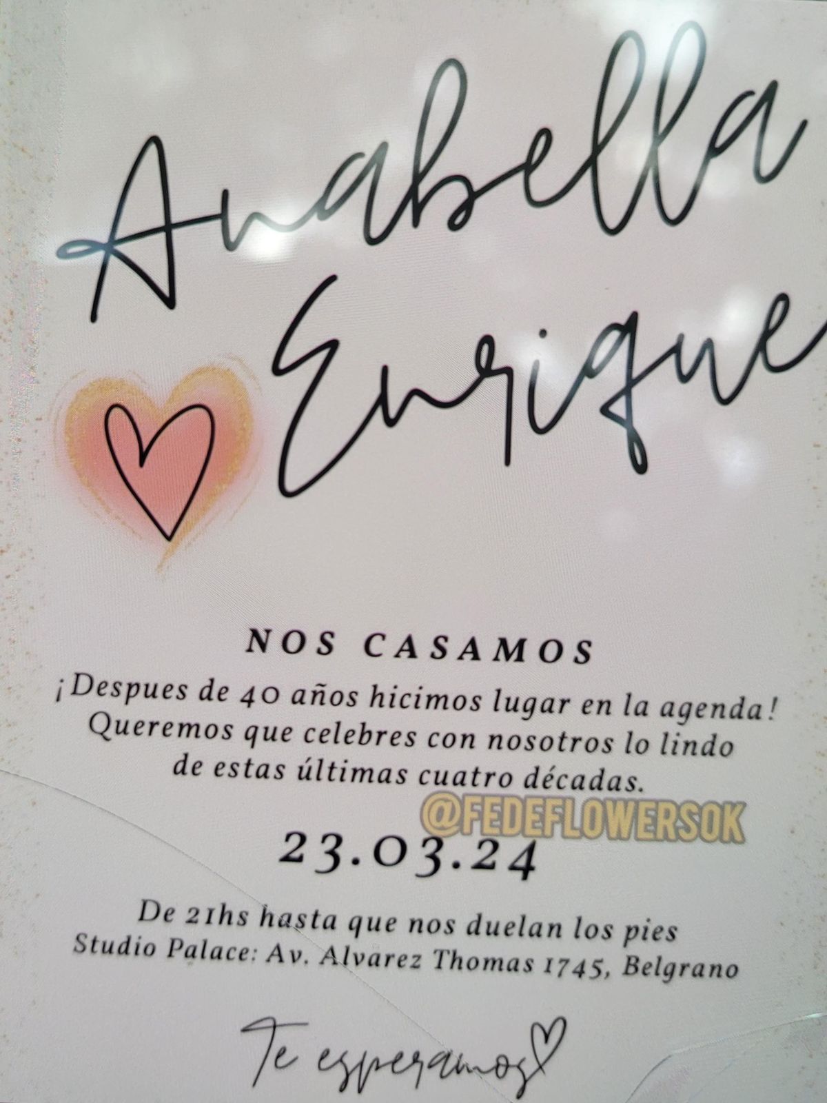 Luego de la ceremonia religiosa, los novios celebraron a lo grande con una fiesta en el salón Studio Palace, en el barrio de Belgrano. “Después de 40 años hicimos lugar en la agenda! Queremos que celebres con nosotros lo lindo de estas últimas cuatro décadas. Desde las 21 y hasta que nos duelan los pies”, decía la invitación.
