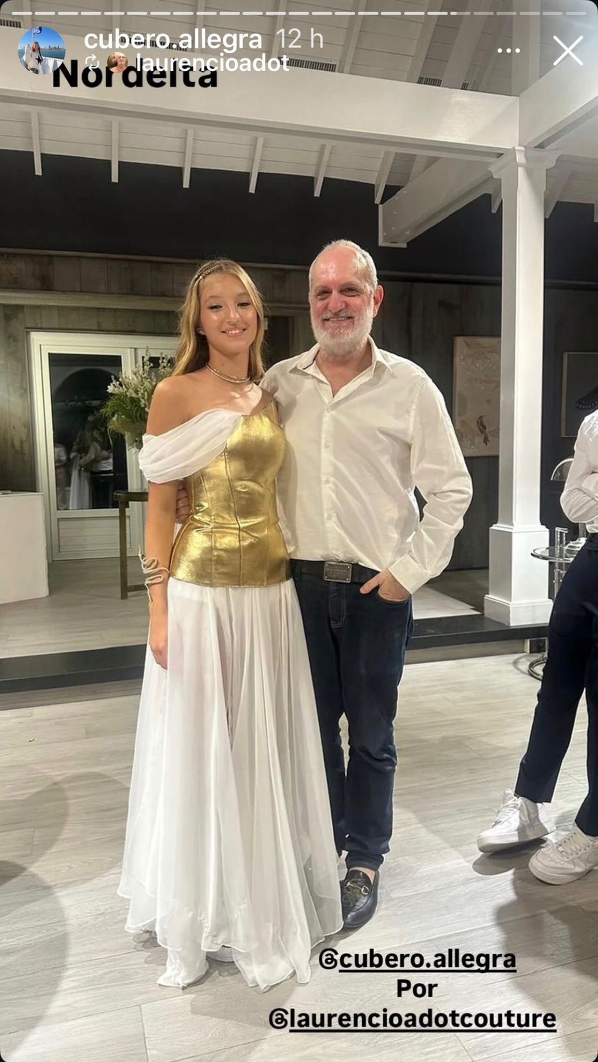 La protagonista de la noche deslumbró con un diseño de Laurencio Adot de aire griego en una paleta que combinó dorado y blanco. El vestido, con escote asimétrico y falda de capas irregulares, evocó una estética clásica adaptada a un lenguaje contemporáneo, logrando un equilibrio entre elegancia y frescura juvenil.