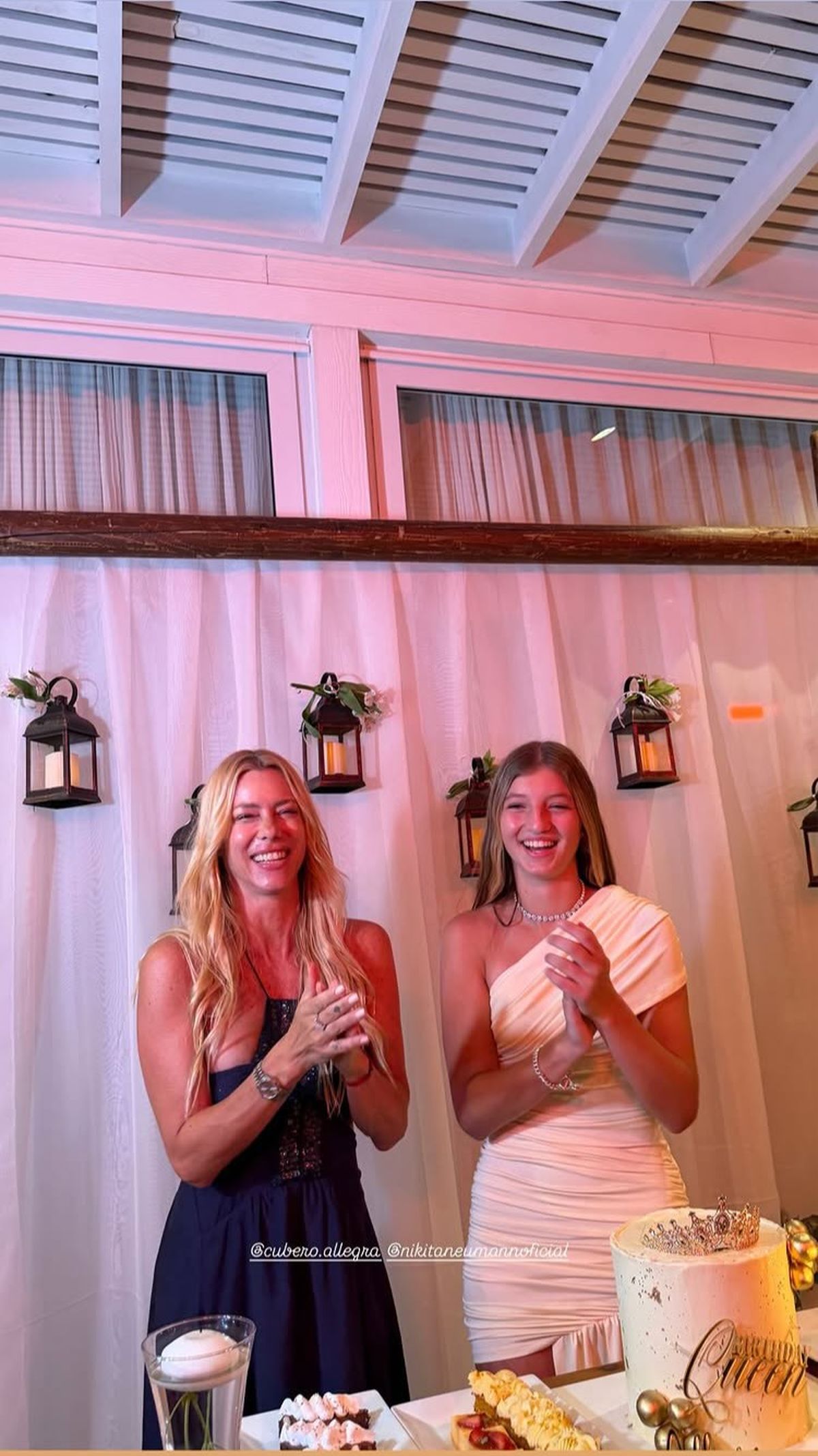 La noche estuvo atravesada por la emoción y la complicidad madre e hija, algo que se reflejó tanto en la elección de los looks como en la ambientación. Hubo instantes originales que sorprendieron a los invitados, una torta de cuatro pisos que se convirtió en el gran foco visual del salón y una decoración floral con rosas vivientes que aportaron un toque distintivo. Todo estuvo pensado para que Allegra Cubero disfrutara de una celebración inolvidable, marcada por el estilo y el glamour.