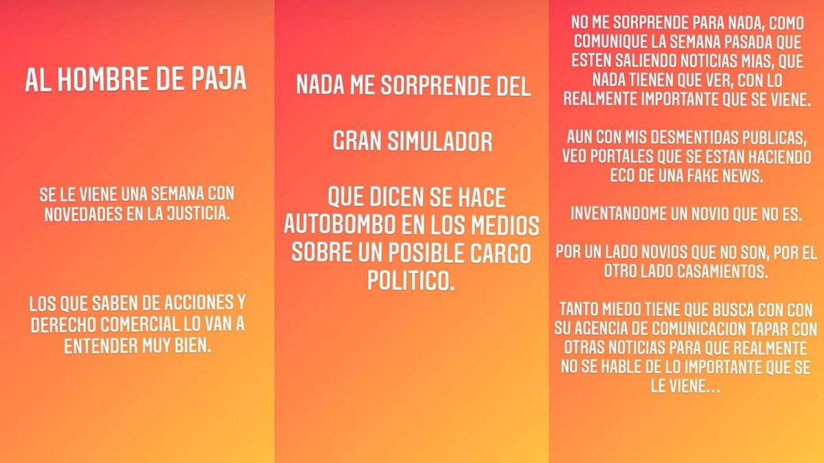 “Aun con mis desmentidas públicas, veo portales que se están haciendo eco de una Fake News, inventándome un novio que no es. Por un lado novios que no son, por el otro lado, casamientos. ¿Tanto miedo tiene, que busca con su agencia de comunicaciones, tapar con otras noticias para que realmente no se hable de lo importante que se viene?”, siguió Luciana Salazar.