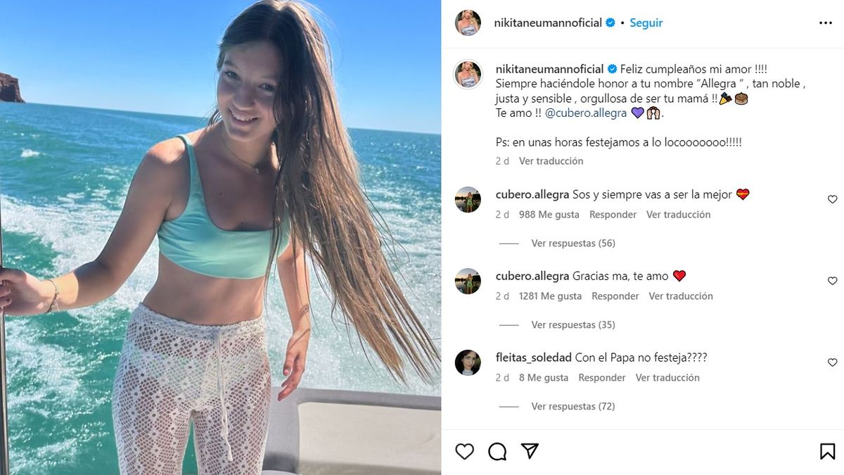 "Feliz cumpleaños mi amor! Siempre haciéndole honor a tu nombre Allegra , tan noble, justa y sensible, orgullosa de ser tu mamá! Te amo!", expresó por su parte la modelo en las redes.