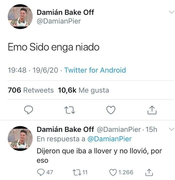 "Emo Sido enga niado", escribió el joven rosarino en Twitter. Pero luego aclaró que lo puso porque anunciaron lluvia y no pasó nada: "Dijeron que iba a llover y no llovió, por eso", contestó.