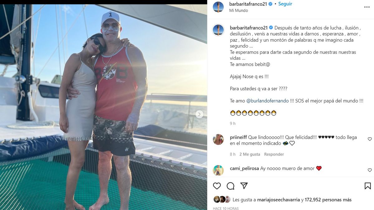 Barby Franco estuvo en La noche del domingo, el programa de Mariano Iúdica en América Tv, y sorprendió a todos con un importante anuncio. “¡Habemus bebé!”, dijo la pareja de Fernando Burlando al confirmar en el ciclo de juegos que tendrá su primer hijo, fruto de su relación con el reconocido abogado.