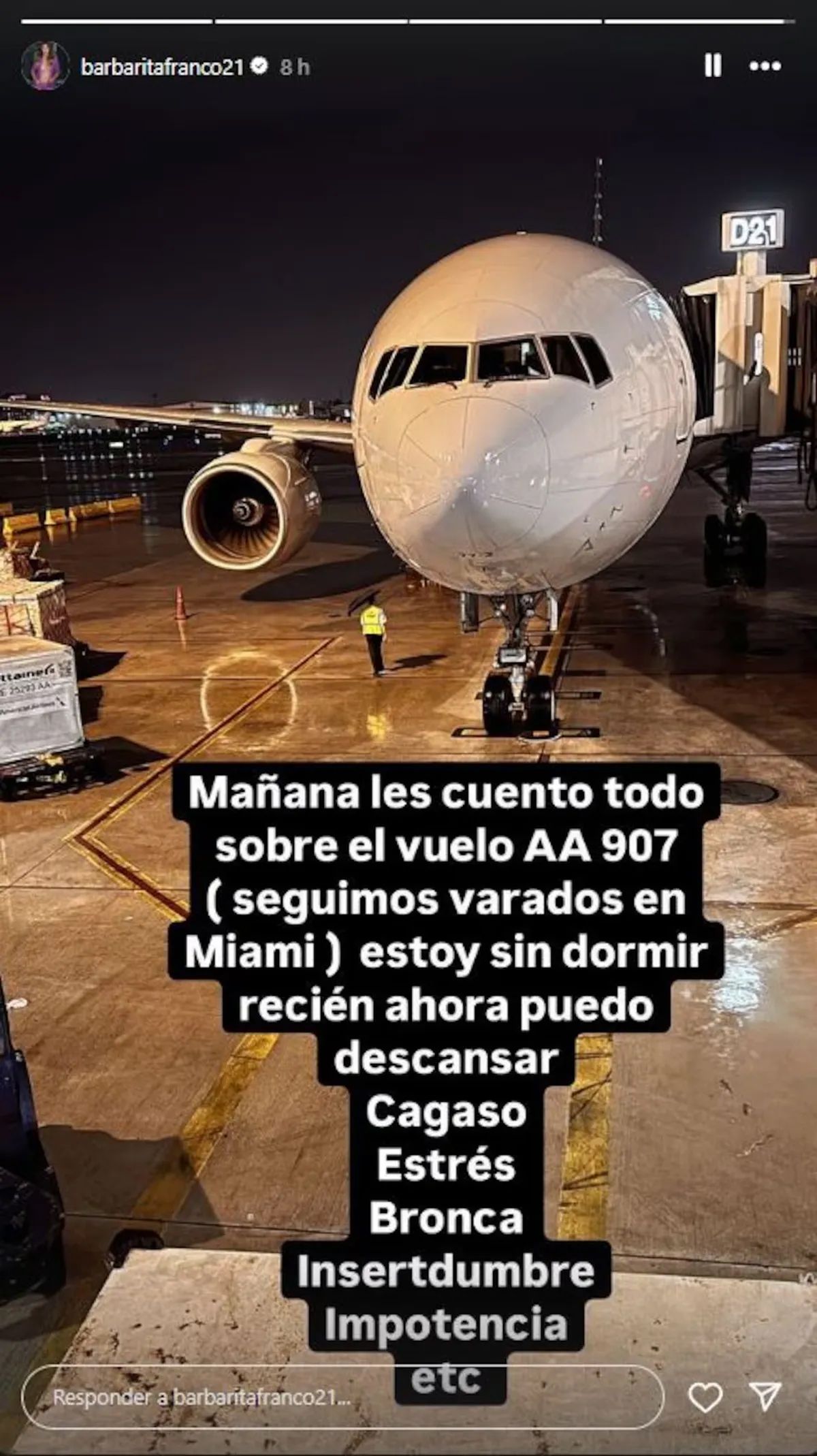 En una historia, Barby Franco relató el calvario que vivieron en el vuelo para volver a la Argentina. “Mañana les cuento todo sobre el vuelo AA 907 (seguimos varados en Miami). Estoy sin dormir, recién ahora puedo descansar. Cagazo, estrés, bronca, incertidumbre, impotencia, etc”, expresó.