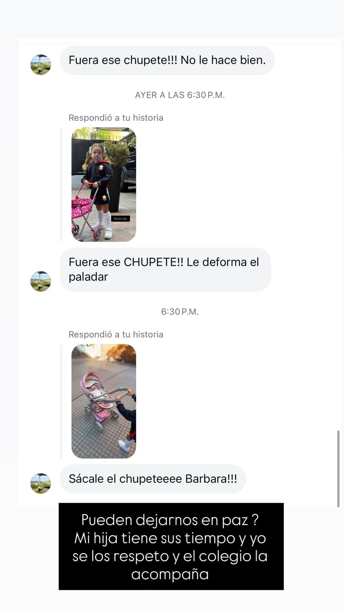 Entre los comentarios, una seguidora fue más allá de la observación casual y repitió varias veces su crítica: "¡¡Fuera ese chupe!! No le hace bien";"¡¡Fuera ese chupete!! Le deforma el paladar" y "¡¡¡Sacale el chupeteee Bárbara!!!".