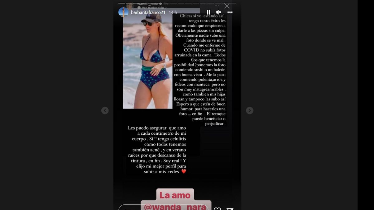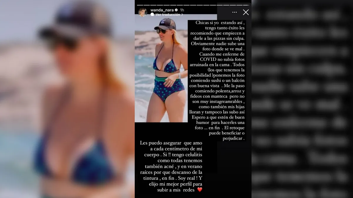 Y Wanda remarcó que acepta su figura: "Les puedo asegurar que amo cada centímetro de mi cuerpo. Sí, tengo celulitis, como todas tenemos, también acné, y, en el verano, raíces porque descanso de la tintura. Soy real! Y elijo mi mejor perfil para subir a mis redes", sentenció.
