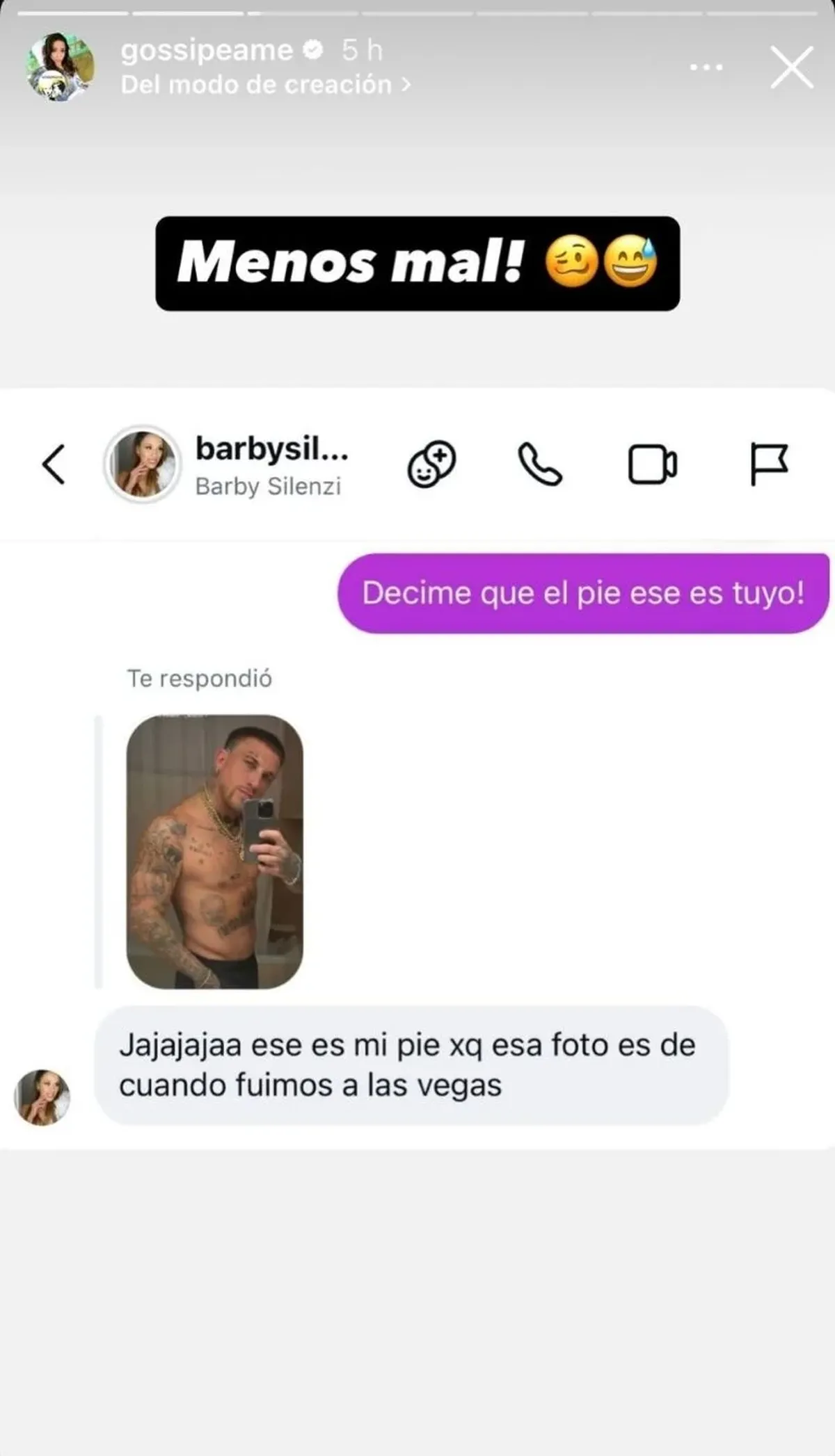 En medio del revuelo, Barby fue consultada directamente por Pochi, de Gossipeame, para saber si ese pie era suyo o si había problemas entre ellos. Lejos de esquivar el tema, la bailarina respondió con humor y fue categórica: "Jajajaja ese es mi pie. Esa foto es de cuando fuimos a Las Vegas".