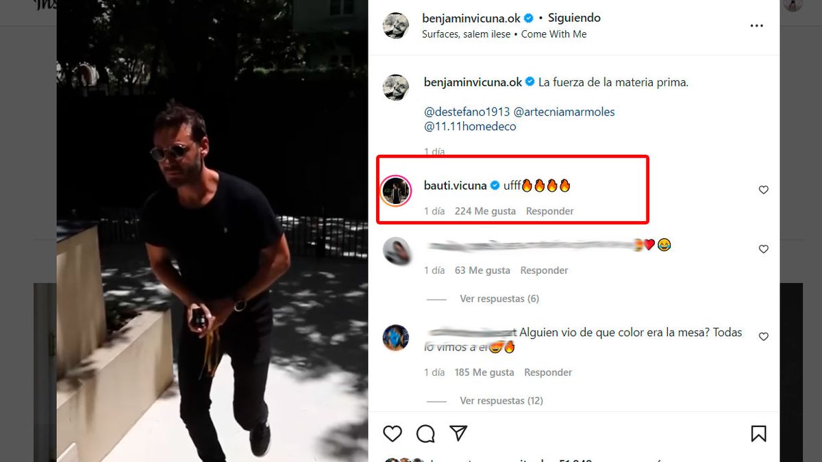 En Instagram, el actor respondió de manera jugada a un comentario de su novia: "Un Campari, por favor", pidió la rubia. A lo que Benjamín Vicuña retrucó de manera hot: "Te hago lo que quieras". Incluso quien comentó también fue uno de sus hijos, Bautista Vicuña, quien expresó: "Uff" y el signo de fuego.