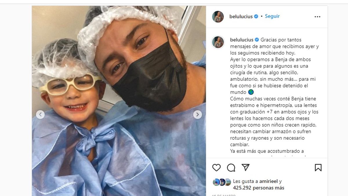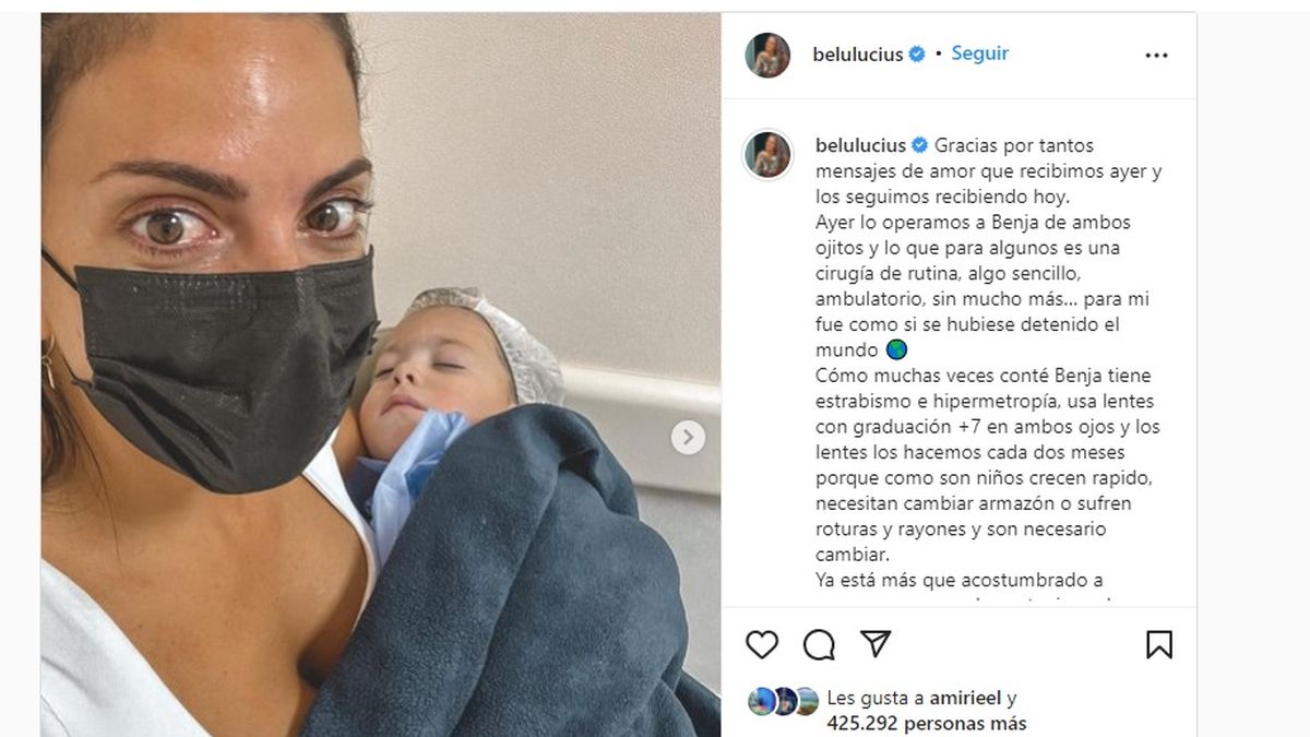 Belu Lucius y su familia vivieron un día de angustia cuando operaron de la vista a su hijo Benjamín de 2 años. La influencer es madre del niño junto al ex puma Javier Ortega Desio y explicó en sus redes lo que le pasó al niño.