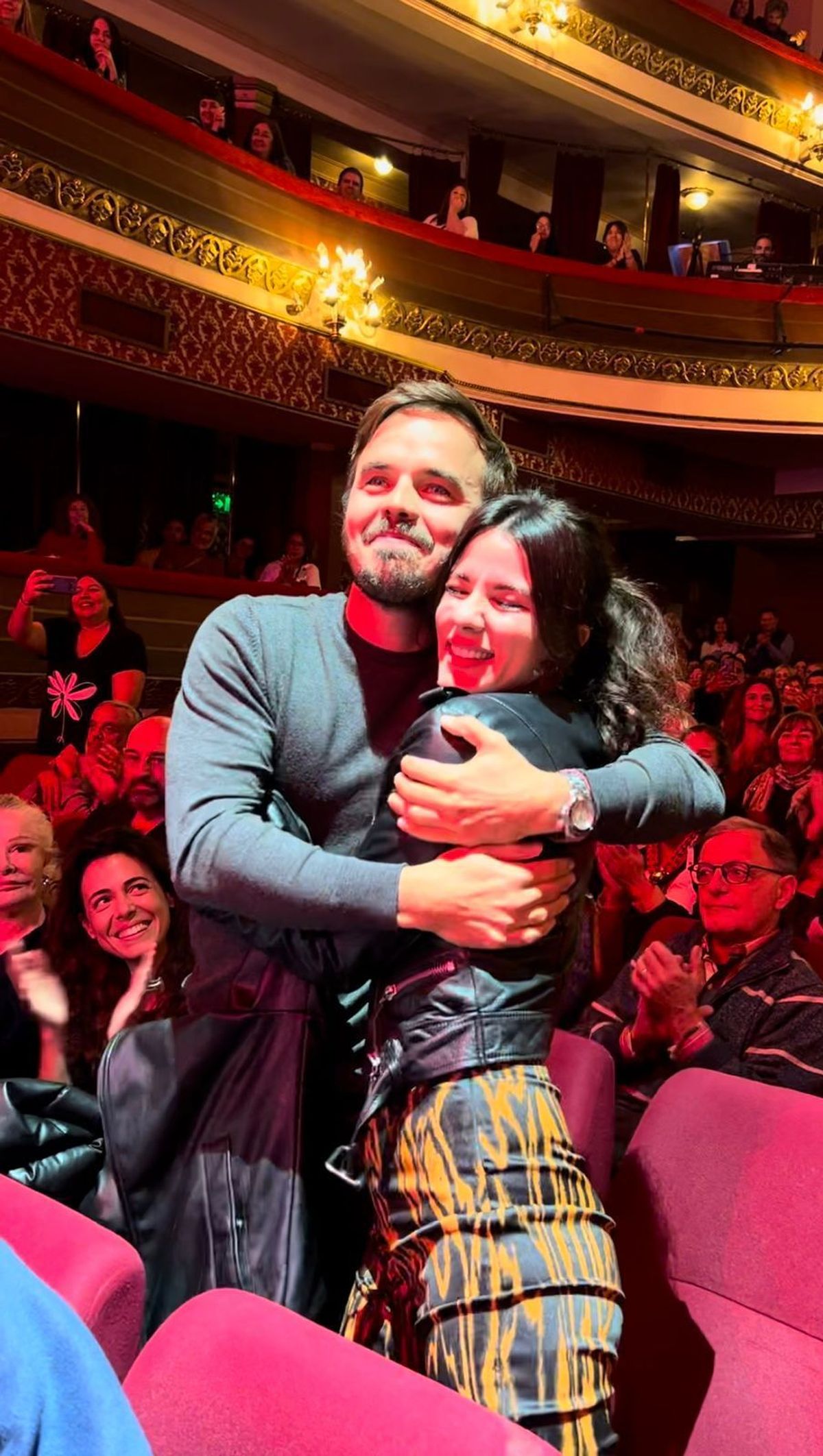 Detrás del escenario también hubo festejos y cánticos de todo el elenco y la producción de la obra junto al campeón mundial, al grito de ¡Leooo Leooo!, al tiempo que luego Vázquez recibió al campeón y su mujer en su camarín.