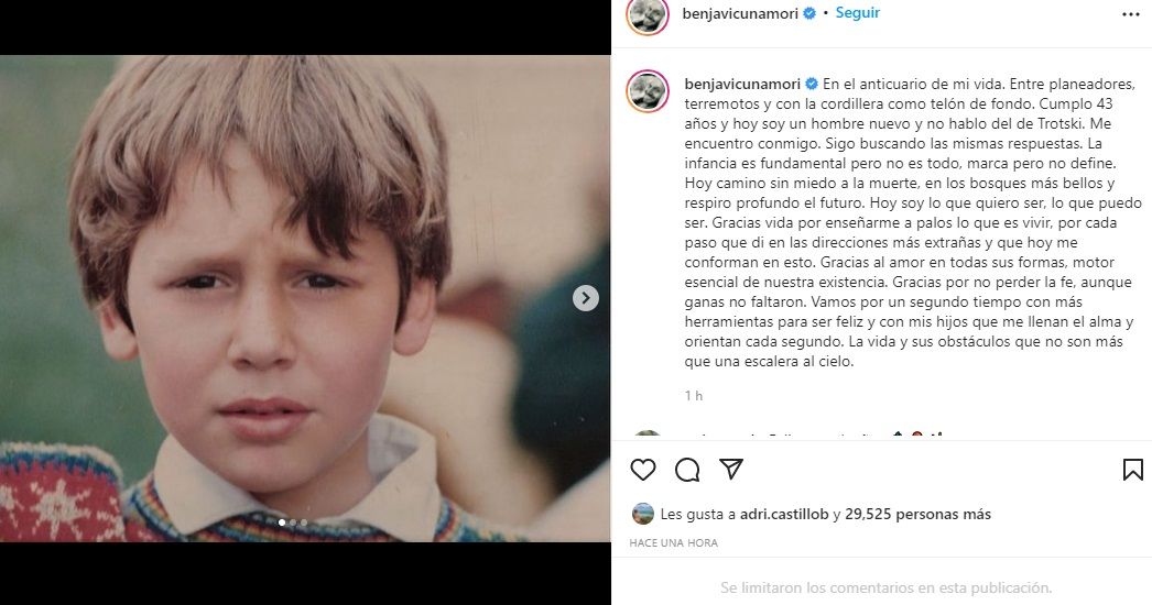 “En el anticuario de mi vida. Entre planeadores, terremotos y con la cordillera como telón de fondo. Cumplo 43 años y hoy soy un hombre nuevo y no hablo del de Trotski. Me encuentro conmigo. Sigo buscando las mismas respuestas. La infancia es fundamental pero no es todo, marca pero no define”, comenzó su posteo el actor.