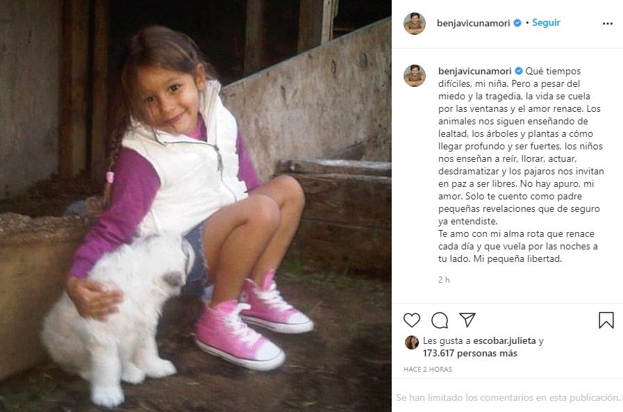 "Te amo con mi alma rota que renace cada día y que vuela por las noches a tu lado. Mi pequeña libertad", cerró Vicuña.