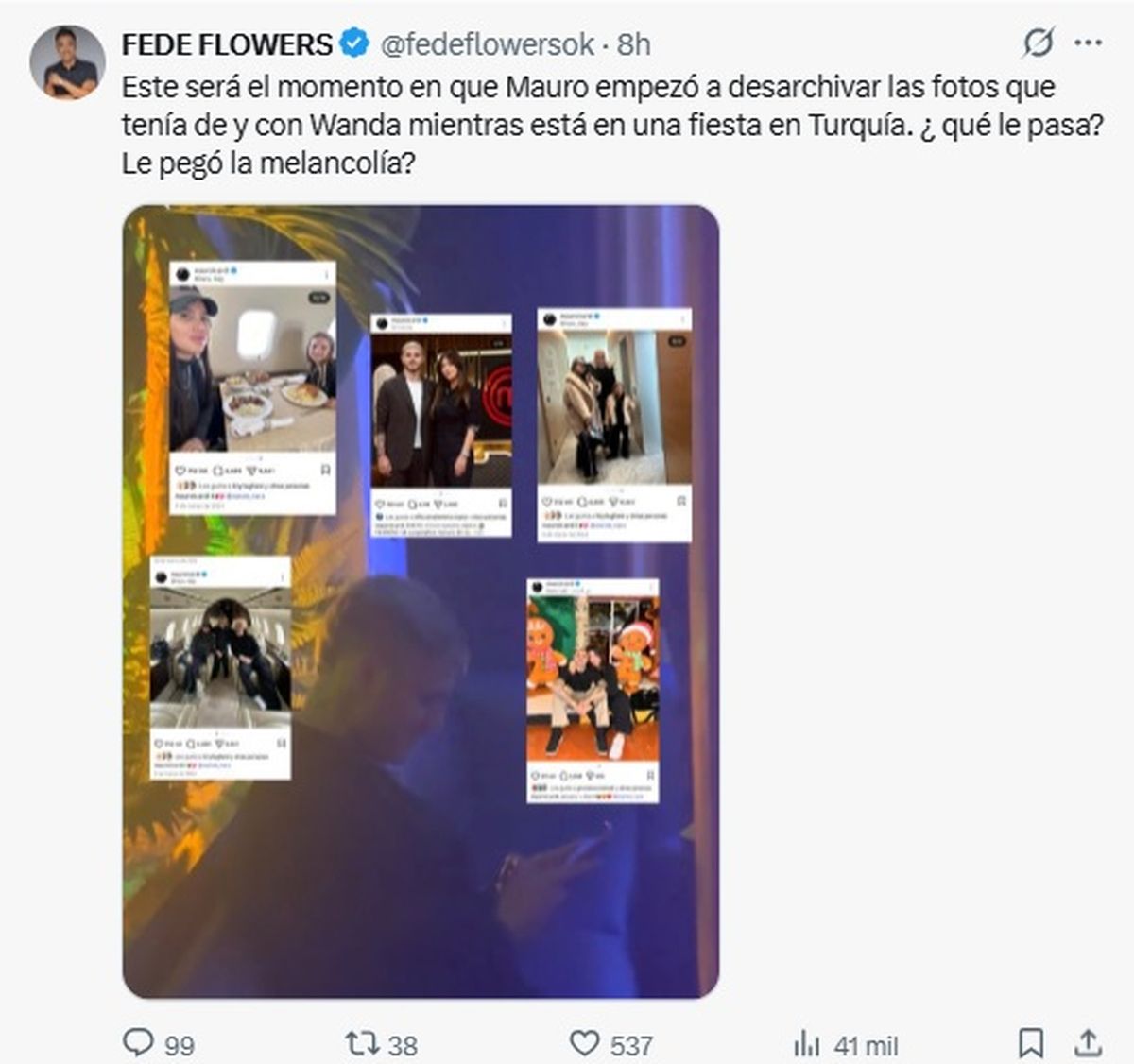 Al tiempo que en un segundo posteo, Flowers se preguntó: “¿Este será el momento en que Mauro empezó a desarchivar las fotos que tenía de y con Wanda mientras está en una fiesta en Turquía?¿ Qué le pasa? ¿Le pegó la melancolía?”, en esta oportunidad acompañando su reflexión con una imagen de Mauro en la fiesta de fondo y varias de las publicaciones que desarchivó.