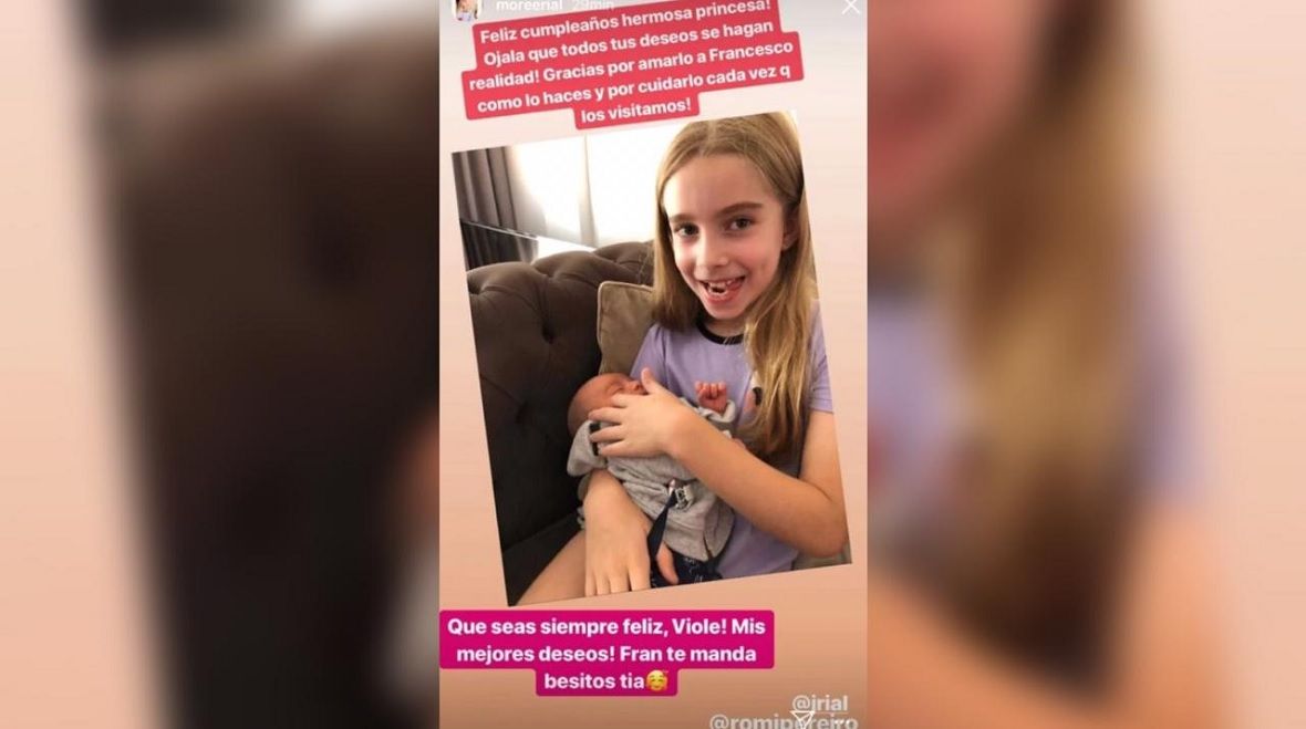 "Feliz cumpleaños, hermosa princesa. Ojalá que todos tus deseos se hagan realidad. Gracias por amar a Francesco y cuidarlo cada vez que los visitamos. Que seas siempre muy feliz, Viole. Mis mejores deseos. Fran te manda un besito, ¡tía!", escribió Morena, junto a una foto de la cumpleañera sosteniendo a su bebé.