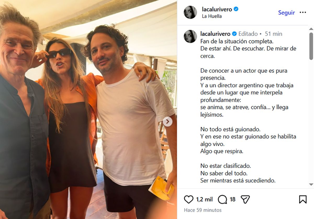 “Fan de la situación completa. De estar ahí. De escuchar. De mirar de cerca. De conocer a un actor que es pura presencia y a un director argentino que trabaja desde un lugar que me interpela profundamente: se anima, se atreve, confía… y llega lejísimos. No todo está guionado y en ese no estar guionado se habilita algo vivo, algo que respira. No estar clasificado, no saber del todo, ser mientras está sucediendo", escribió Rivero, con la intensidad que la caracteriza.