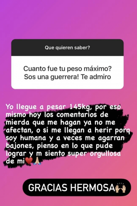 "Yo llegue a pesar 145 kilos. Por eso mismo, los comentarios de mierda que me hagan ya no me afectan... Aunque, a veces, me llegan a herir porque soy humana. Cuando me agarran los bajones pienso en lo que pude lograr y me siento súper orgullosa de mí", fue la frase que usó Morena Rial en una de sus respuestas de stories ante la consulta de un usuario.