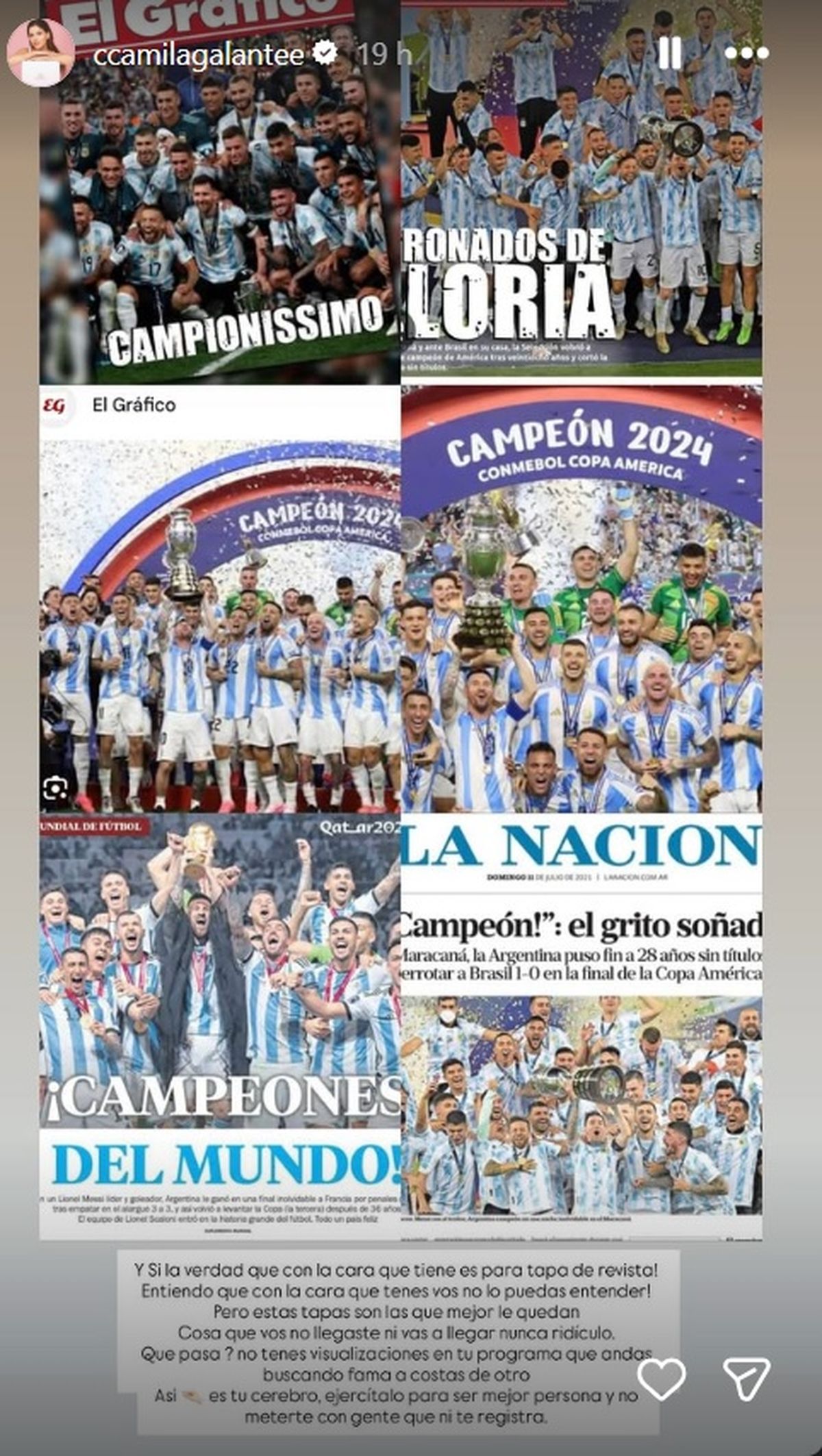 La modelo optó por hacer un collage con las fotos de tapa con los títulos que obtuvo Paredes con la Selección Argentina y sin nombrarlo directamente le contestó fuerte al periodista.