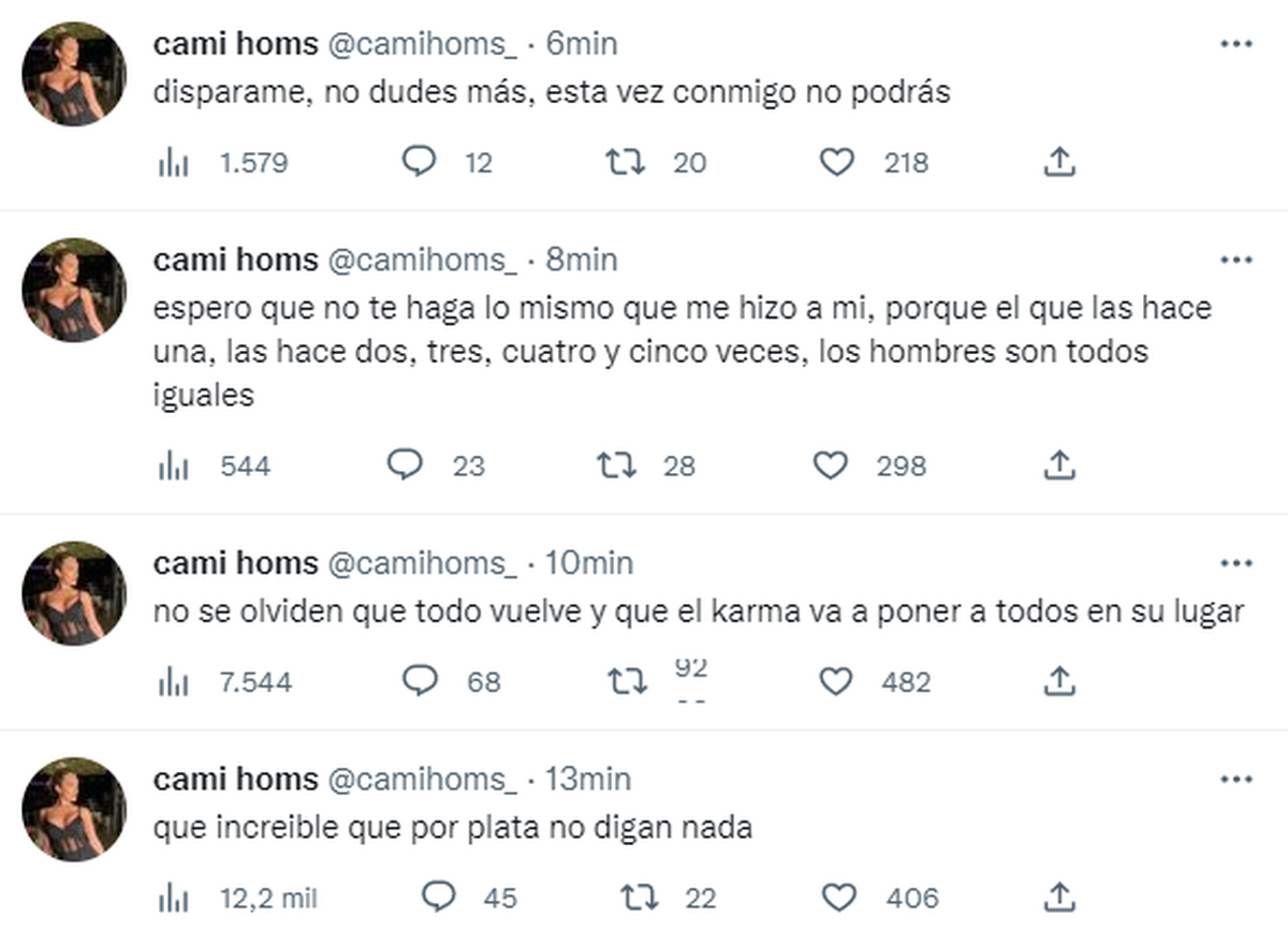 Este viernes, luego de que explote la bomba de la denuncia de Rodrigo de Paul a Camila Homs, comenzaron a aparecer tuits en la cuenta oficial de la modelo, muy fuertes, en contra de su ex y de su actual pareja, la cantante Tini Stoessel.