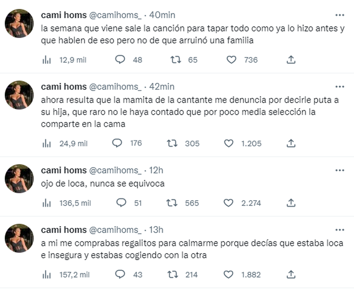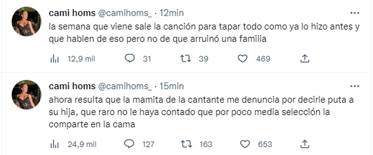 Mientras estaban leyendo esos posteos en Intrusos, la cuenta de Homs se reactivó con más tuits: "Ahora resulta que la mamita de la cantante me denuncia por decirle put... a su hija, que raro no le haya contado que por poco media selección la comparte en la cama", "La semana que viene sale la canción, para tapar todo como ya lo hizo antes, y que hablen de eso, pero no de que arruinó una familia", "Espero que no te haga lo mismo que me hizo a mi, porque el que las hace una, las hace dos, tres, cuatro y cinco veces, los hombres son todos iguales".