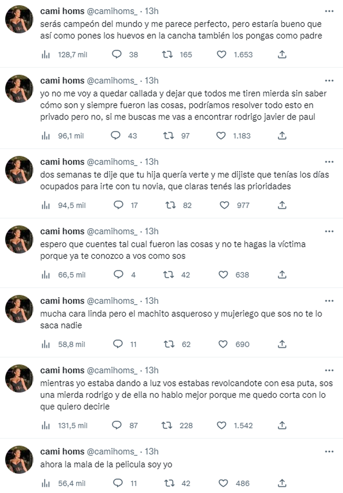 "Dos semanas te dije que tu hija quería verte y me dijiste que tenías los días ocupados para irte con tu novia, que clara tenés las prioridades", "Yo no me voy a a quedar callada y dejar que todos me tiren mierda sin saber cómo son y siempre fueron las cosas, podríamos resolver todo esto en privado pero no, si me buscas me vas a encontrar Rodrigo Javier De Paul", "Serás campeón del mundo y me parece perfecto, pero estaría bueno que así como pones los huevos en la cancha también los pongas como padre", "A mi me comprabas regalitos para calmarme porque decías que era una loca e insegura y estabas cog... con la otra", siguió.