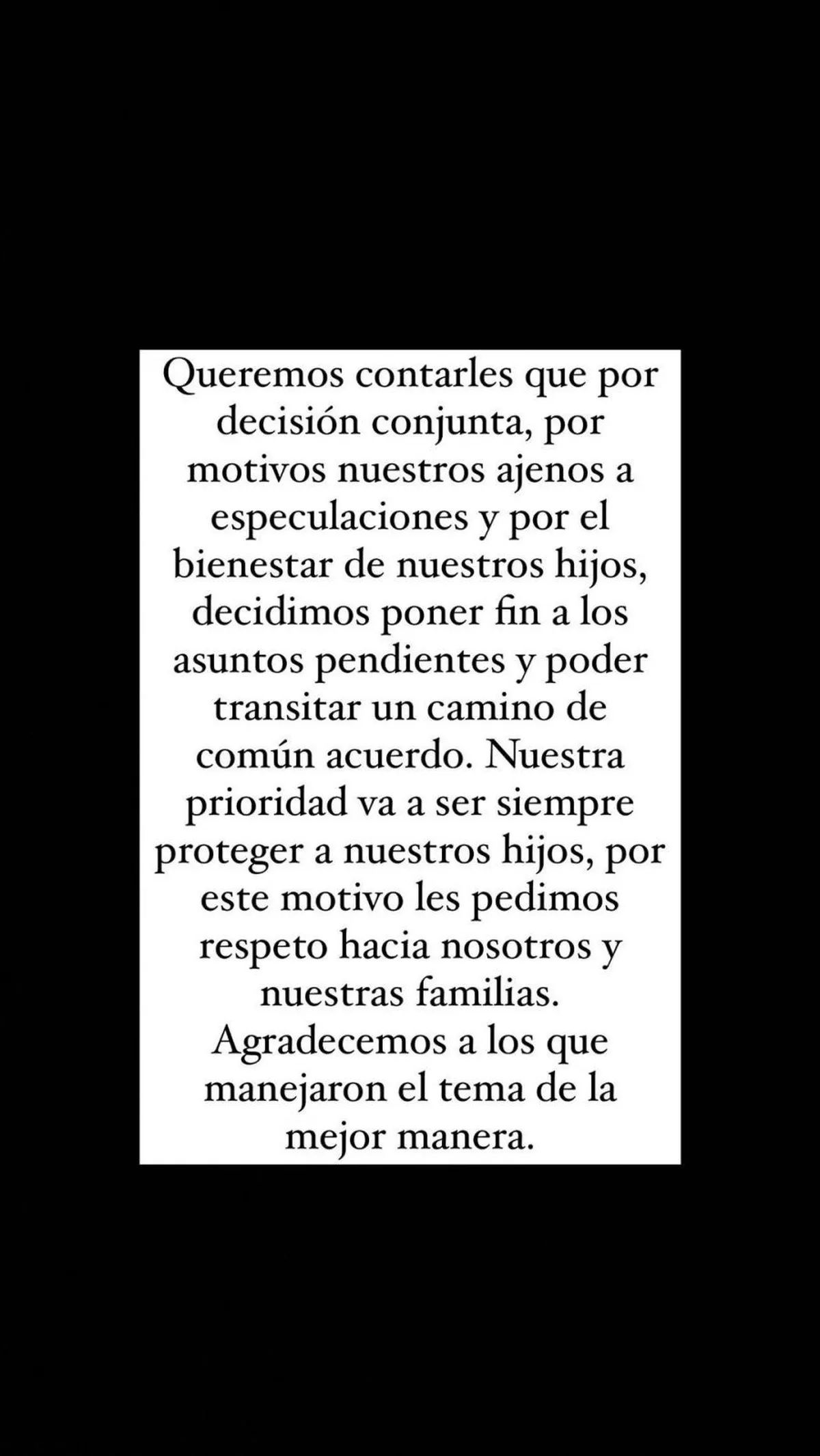 “Queremos contarles que por decisión conjunta, por motivos nuestros, ajenos a especulaciones y por el bienestar de nuestros hijos, decidimos ponerle fin a los asuntos pendientes y poder transitar un camino de común acuerdo”, dice la primera parte del comunicado.