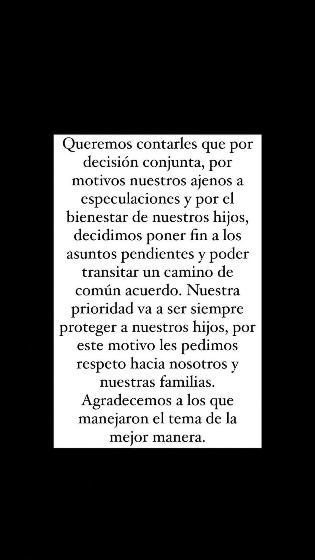 “Nuestra prioridad va a ser siempre proteger a nuestros hijos, por este motivo les pedimos respeto hacia nosotros y nuestras familias”. Continuó la modelo y finalizó el posteo con un agradecimiento general. “Agradecemos a los que manejaron el tema de la mejor manera”.