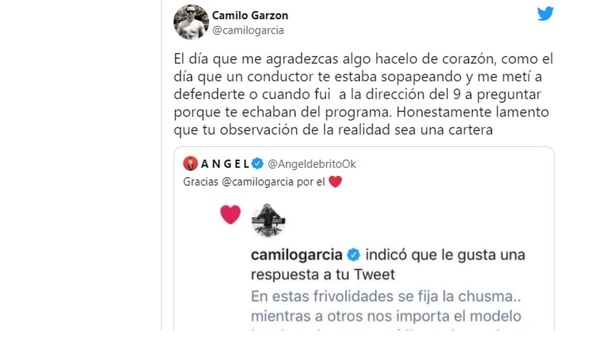 "El día que me agradezcas algo hacelo de corazón, como el día que un conductor te estaba sopapeando y me metí a defenderte o cuando fui a la dirección del 9 a preguntar porque te echaban del programa. Honestamente lamento que tu observación de la realidad sea una cartera", retrucó García.